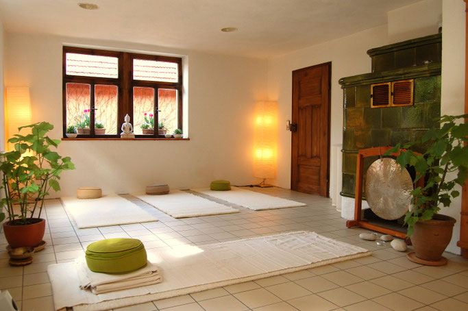 Der Übungsraum unserer kleinen Yogaschule in Dielheim-Balzfeld besticht durch seinen ländlichen Charme. Der größte Raum des Fachwerk-Bauernhauses wurde speziell für Yogakurse eingerichtet. Er ist mit Fußbodenheizung und Kachelofen ausgestattet.